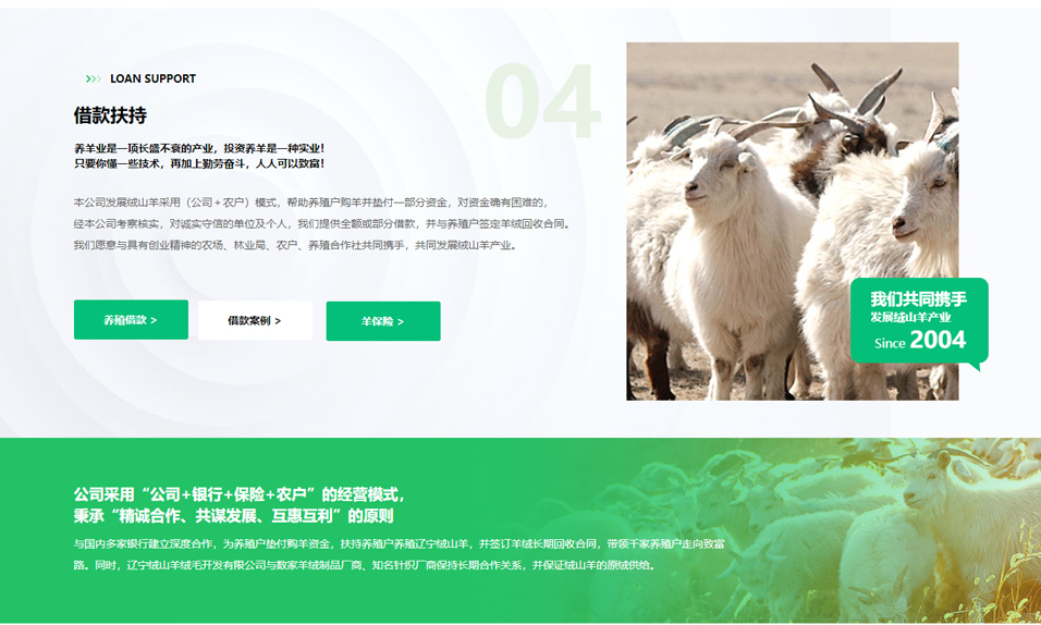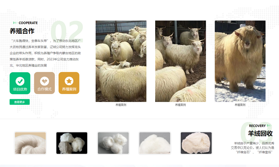 遼寧絨山羊絨毛開發(fā)有限公司采用“公司+銀行+保險+農(nóng)戶”的經(jīng)營模式,秉承“精誠合作、共謀發(fā)展、互惠互利”的原則,與國內(nèi)多家銀行建立深度合作,為養(yǎng)殖戶墊付購羊資金,扶持養(yǎng)殖戶養(yǎng)殖遼寧絨山羊,并簽訂羊絨長期回收合同,帶領(lǐng)千家養(yǎng)殖戶走向致富路。同時,遼寧絨山羊絨毛開發(fā)有限公司與數(shù)家羊絨制品廠商、知名針織廠商保持長期合作關(guān)系,并保證絨山羊的原絨供給。
